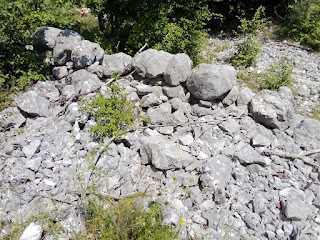 Dolje: predio u podnožju planine Čabulje gdje je autor razotkrio jednu fenomenalnu atipičnu gradinu otvorenog tipa, u okviru koje se nalaze, osim masivnih i megalitskih bedema, isto tako i raznorazne očito prastare suhozidne kuće (gdje su mjestimično u pojedinim izvornim najmonumentalnijih takvim suhozidnim kućama pronađeni fragmenti prastare grube keramike), koje su jednim dijelom iskorištavane i nadograđivane u novijoj povijesti za potrebe pojata i stanova- uz što je sve razotkriven te ekskluzivno fotografiran izbliza jedan omanji no zaista formom i geologijom spektakularni uski kanjon koji se proteže sve do sredine visine planine Čabulje na ovom dijelu padine
